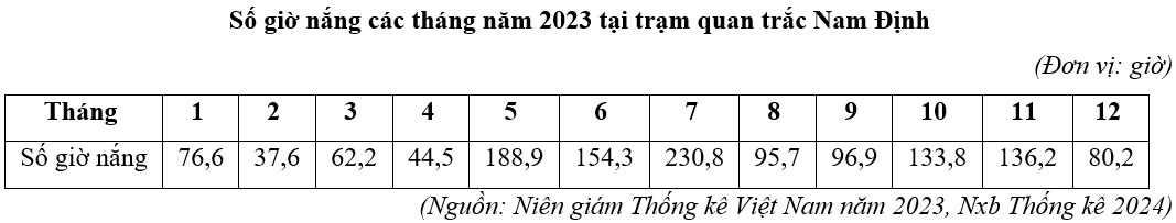 Cho bảng số liệu:Căn cứ vào bảng số liệu trên, hãy cho biết tổng số giờ nắng năm 2023