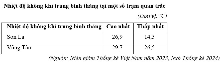 Căn cứ vào bảng số liệu trên, hãy cho biết biên độ nhiệt trung bình năm của Sơn La cao hơn so với biên độ nhiệt trung bình năm của Vũng Tàu là bao nhiêu ⁰C (làm tròn kết quả đến một chữ số thập phân).