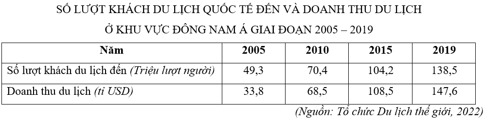 | b) Trong giai đoạn 2005 - 2019 doanh thu du lịch của khu vực Đông Nam Á tăng gần 100 tỉ USD. | ||