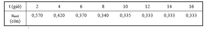 Thực hiện phản ứng este hóa giữa 1 mol CH3COOH và 1 mol C2H5OH. Sau mỗi lần hai giờ xác định số mol axit còn lại, kết quả như sau :