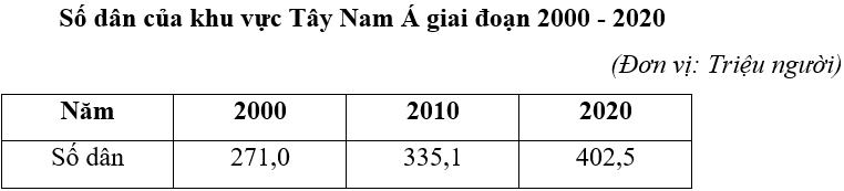 Căn cứ vào bảng số liệu, tính tốc độ tăng trưởng số dân của khu vực Tây Nam Á năm 2020 so với năm 2010 (làm tròn kết quả đến hàng đơn vị của %).