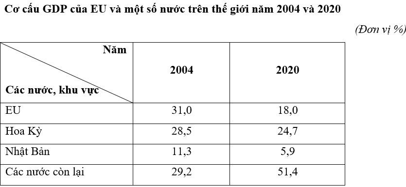 Cho bảng số liệu:a. Vẽ biểu đồ thể hiện cơ cấu GDP của EU và một số nước trên thế