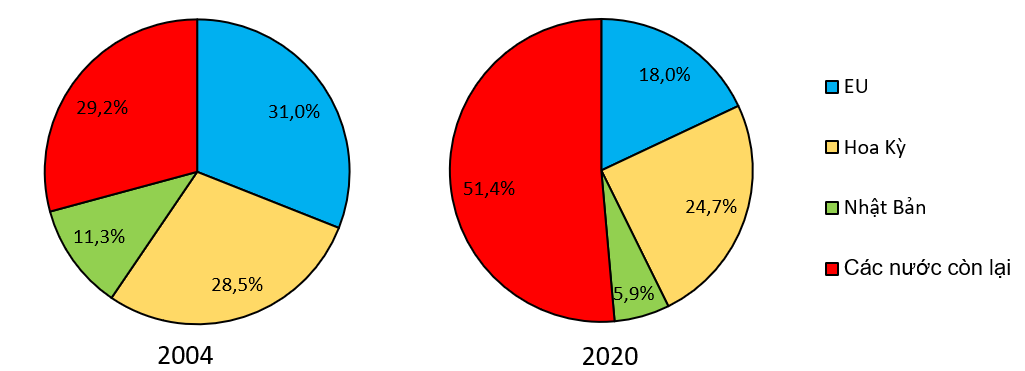 a. Vẽ biểu đồ thể hiện cơ cấu GDP của EU và một số nước trên thế giới năm 2004 và năm 2020.