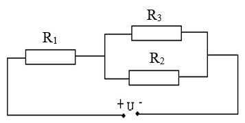 Cho đoạn mạch điện có sơ đồ như hình vẽ bên. Biết hiệu điện thế giữa hai đầu mạch là U = 6 V, các điện trở trong mạch là \({R_1} = 1,25\,\,\Omega ;\,\,{R_2} = 6\,\,\Omega \). Biết cường độ dòng điện qua \({R_1}\) là 2 A. Điện trở \({R_3}\) có giá trị bằng bao nhiêu \(\Omega \)? (Kết quả lấy đến 3 chữ số có nghĩa).