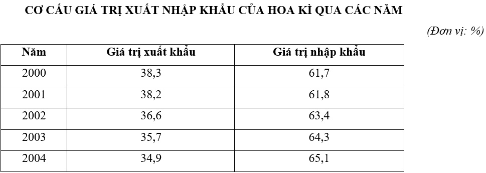 Cho bảng số liệu sau:Nhận xét về cơ cấu giá trị xuất nhập khẩu của Hoa Kì giai đoạn 2000