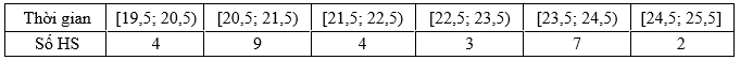 Cho bảng số liệu thống kê về thời gian (phút) hoàn thành một bài tập Toán của mỗi học sinh