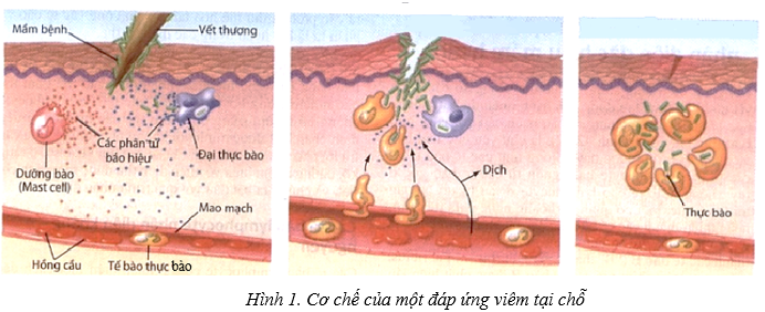 Sưng và đau báo động cho bạn về một tổn thương dưới da chính là kết quả của một đáp ứng viêm tại chỗ, đó là những thay đổi do các phân tử được giải phóng khi bị thương hoặc nhiễm trùng. Một phân tử báo hiệu viêm quan trọng là histamine, được dự trữ trong các dưỡng bào (tế bào mast), đó là các mô liên kết dự trữ các hóa chất tiết ra ngoài dưới dạng hạt. Hình dưới đây tóm tắt lại tiến trình của các sự kiện trong viêm tại chỗ, bắt đầu với nhiễm trùng từ một vết thương.
