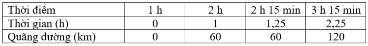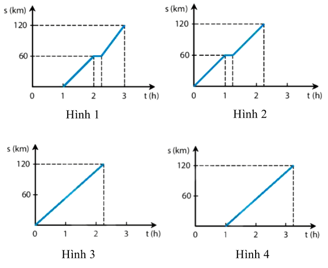 Lúc 1 h sáng, một đoàn tàu hỏa chạy từ ga A đến ga B với tốc độ 60 km/h, đến ga B lúc 2 h và dừng ở ga B 15 min. Sau đó, đoàn tàu tiếp tục chạy với tốc độ cũ thì đến ga C lúc 3 h 15 min. Hình ___ biểu diễn đúng đồ thị quãng đường – thời gian của đoàn tàu nói trên.