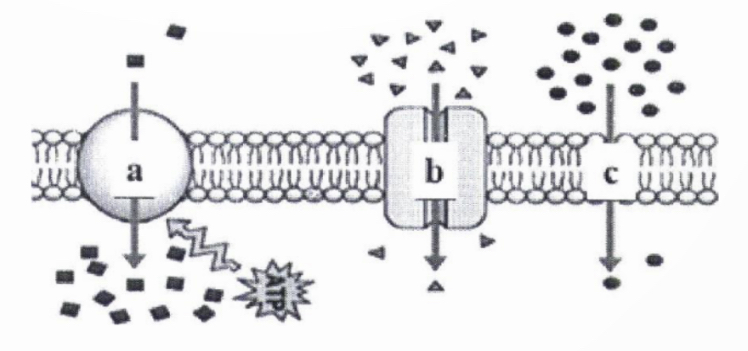 Quan sát 3 hình thức vận chuyển các chất qua màng tế bào (a), (b), (c) ở hình dưới đây và cho