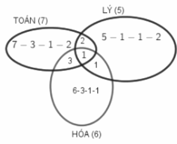 Lớp 10B có 7 học sinh giỏi Toán, 5 học sinh giỏi Lý, 6 học sinh giỏi Hóa, 2 học sinh chi giỏi Toán và Lý, 3 học sinh chỉ giỏi Toán và Hóa, 1 học sinh chi giỏi cả Lý và Hóa, 1 học sinh giỏi cả 3 môn Toán, Lý, Hóa. Khi đó: