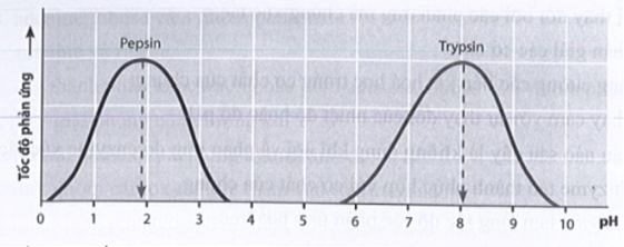 Cho đồ thị thể hiện tốc độ của phản ứng có sự xúc tác của enzyme pepsin và trypsin theo pH