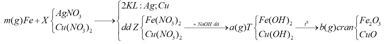 1. Cho m gam bột sắt vào dung dịch $\text{X}$ chứa AgNO3 và Cu(NO3)2 đến khi các phản ứng kết thúc thu được chất rắn Y (chứa 2 kim loại) và dung dịchZ. Cho dung dịch Z tác dụng hết với dung dịch NaOH dư, lọc thu được a gam kết tủa T gồm hai hydroxide kim loại. Nung T trong không khí đến khối lượng không đổi thu được b gam chất rắn. Lập biểu thức tính m theo a và b.