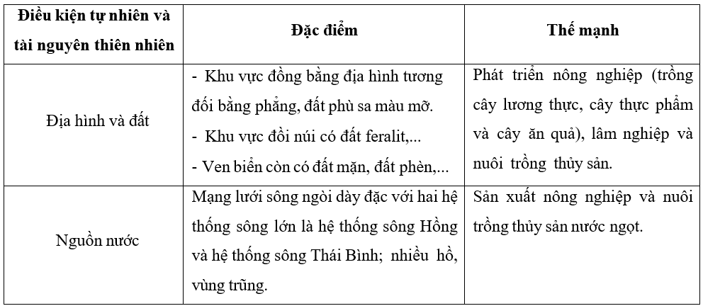 Dựa vào nội dung điều kiện tự nhiên và tài nguyên thiên nhiên (phần địa hình và đất; nguồn nước) của Đồng bằng sông Hồng, từ đó phân tích tới thế mạnh đối với sự phát triển nông – lâm – thủy sản.