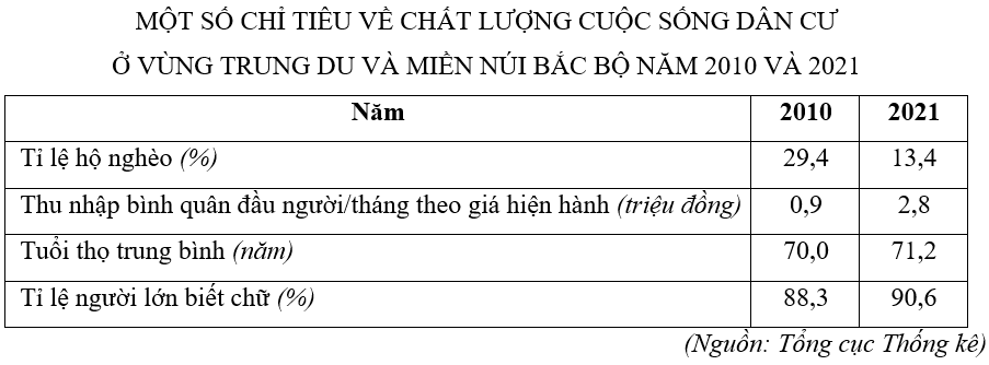 a) Dựa vào bảng số liệu và nhận xét về chất lượng cuộc sống của vùng Trung du và miền núi Bắc Bộ trên các khía cạnh: