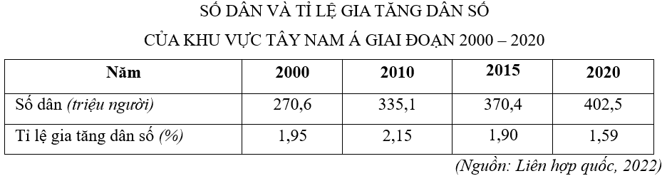 Theo bảng số liệu, để thể quy mô dân số và tỉ lệ gia tăng dân số của khu vực Tây Nam Á giai đoạn 2000 - 2020, biểu đồ nào sau đây là thích hợp nhất?