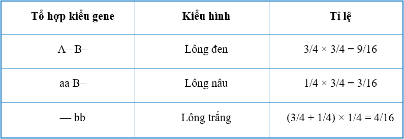 Ở chuột nhảy (Meriones unguiculatus), với hai cặp gene không allele thuộc 2 nhiễm sắc thể khác nhau cùng quy định màu sắc lông chuột: A quy định lông đen, a quy định lông nâu, B giúp tích trữ sắc tố, b không tích trữ sắc tố nên lông trắng. (A-B-: lông đen, aaB-: lông nâu, A-bb: lông trắng). Cho lai chuột lông đen dị 2 cặp với nhau: AaBb x AaBb, ta thu được tỉ lệ kiểu hình đời con như thế nào? Biết rằng không có xảy ra đột biến, không có cá thể chết.