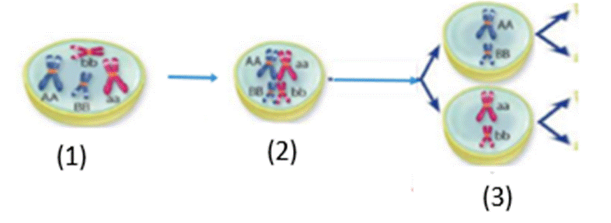 (1): Tế bào mẹ (2n), mang 2 cặp NST gồm: AA, aa và BB, bb