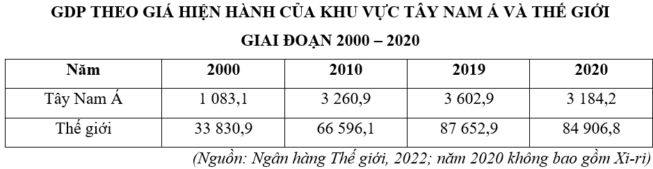 Căn cứ vào bảng số liệu trên, hãy cho biết giai đoạn 2000 – 2020, khu vực Tây Nam Á hay thế giới có tốc độ tăng trưởng GDP cao hơn?