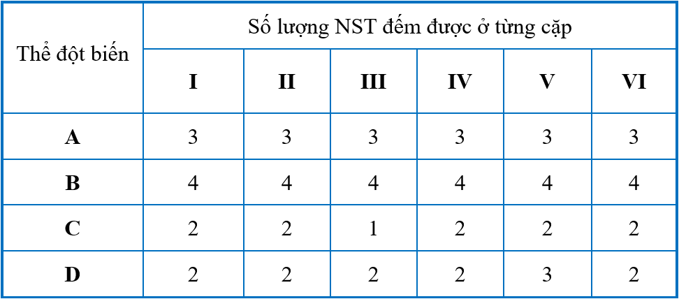 Bộ NST lưỡng bội của một loài thực vật hạt kín, có 6 cặp NST kí hiệu là I, II, III, IV, V, VI. Khi khảo sát một quần thể của loài này người ta phát hiện có bốn thể đột biến kí hiệu là A, B, C, D. Phân tích tế bào của bốn thể đột biến trên người ta thu được kết quả như sau: