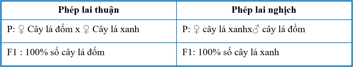 - Kết quả lai thuận – nghịch cho thấy: con luôn mang kiểu hình của mẹ (♀ lá đốm → F1 lá đốm; ♀ lá xanh → F1 lá xanh).