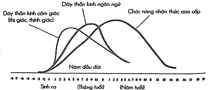 Bộ não con người phát triển mạnh mẽ nhất trong năm đầu tiên của cuộc đời. Các dây thần kinh cảm giác phát triển đầu tiên, tiếp theo là thần kinh ngôn ngữ, các chức năng nhận thức cao cấp tiếp tục phát triển cho đến những năm tiểu học hoặc trung học cơ sở. Nhìn vào hình ảnh minh họa ở hình 7, ta có thể thấy được thứ tự phát triển cảm giác, ngôn ngữ và chức năng nhận thức cao cấp của trẻ từ sơ sinh cho đến khi tròn 1 tuổi. Đặc biệt giai đoạn tròn 1 tuổi là thời điểm đạt đến mốc phát triển vô cùng quan trọng.