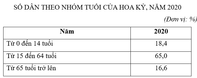 Căn cứ vào bảng số liệu, tính số dân trong nhóm tuổi từ 0 đến 14 tuổi, biết tổng số dân Hoa Kỳ năm 2020 là 331,5 triệu người. (làm tròn kết quả đến hàng đơn vị của triệu người)