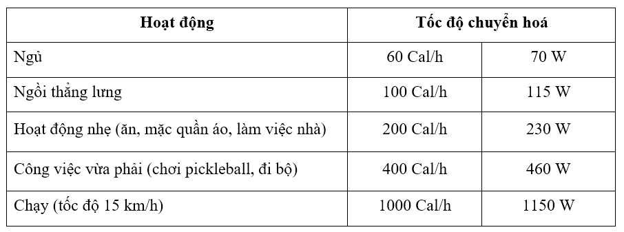 Tốc độ chuyển hóa năng lượng của cơ thể là tốc độ mà năng lượng bên trong được chuyển hóa trong cơ thể để sử dụng cho các hoạt động hàng ngày. Nó thường được biểu thị bằng đơn vị Cal/h (Calorie/giờ) hoặc W (Oát). Các tốc độ chuyển hóa điển hình cho một số hoạt động của con người được liệt kê trong Bảng ở dưới dành cho một người trưởng thành "trung bình" nặng 65 kg.