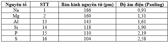 Dưới đây là bảng số liệu về bán kính nguyên tử và độ âm điện của các nguyên tố ở chu kì 3.