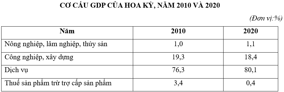 | a) Tỉ trọng nông nghiệp, lâm nghiệp, thủy sản luôn thấp nhất trong cơ cấu GDP của Hoa Kỳ nhưng tăng nhẹ. | ||