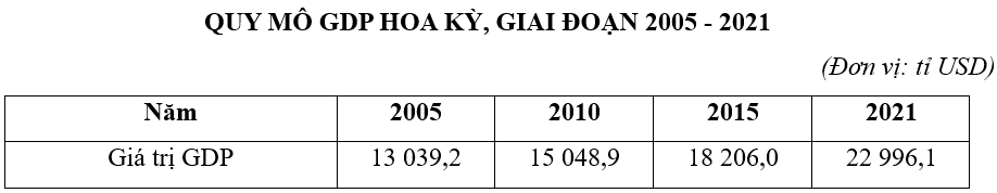 Căn cứ vào bảng số liệu, hãy cho biết GDP của Hoa Kỳ năm 2021 tăng bao nhiêu % so với năm 2005 (làm tròn kết quả đến hàng đơn vị).
