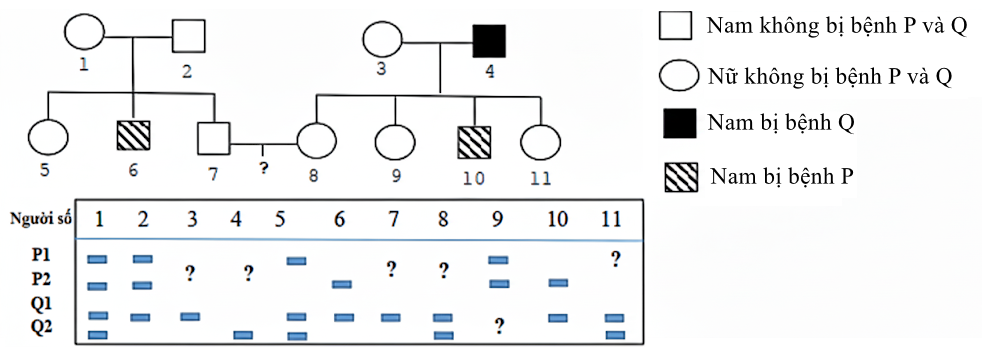 Cho biết không xảy ra đột biến và bệnh P do gene P có 2 allele là P1 và P2 quy định; Bệnh Q do gene Q có 2 allele là Q1 và Q2 quy định, gene quy định bệnh P và Q phân li độc lập. Xác suất cặp vợ chồng 7-8 sinh con trai không mang allele bệnh là bao nhiêu?