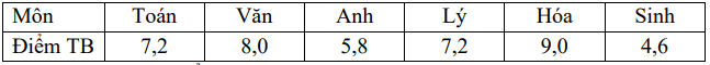 Cuối học kì I vừa qua, bạn An đạt được kết quả sáu môn như sau:
