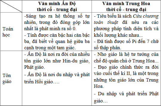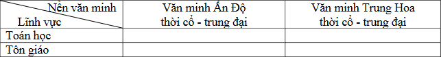 Lập bảng về thành tựu tiêu biểu của văn minh Ấn Độ thời cổ - trung đại và văn minh Trung Hoa thời cổ - trung đại theo mẫu: