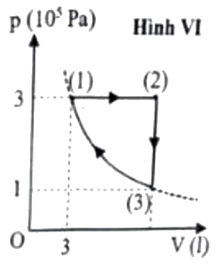 Cho 0,3 mol khí lí tưởng biến đổi từ trạng thái (1) sang các trạng thái (2), (3) thông qua các quá trình được biểu diễn trên đồ thị hình VI, trong đó quá trình (3) - (1) là quá trình mà áp suất tỉ lệ nghịch với thể tích khí. Cho hằng số khí lí tưởng R = 8,31 J/(mol.K).