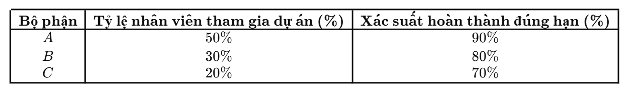 Trong một công ty, ba bộ phận A, B và C tham gia vào một dự án mới. Tỷ lệ nhân viên của mỗi bộ phận tham gia vào dự án và xác suất mỗi bộ phận hoàn thành công việc đúng hạn được biểu diễn trong bảng dưới đây: