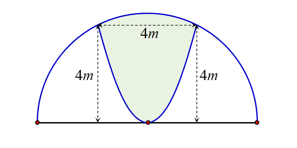 Một khuôn viên dạng nửa hình tròn có đường kính bằng $4\sqrt{5}$ (m). Trên đó người thiết kế hai phần để trồng hoa có dạng của một cánh hoa hình parabol có đỉnh trùng với tâm nửa hình tròn và hai đầu mút của cánh hoa nằm trên nửa đường tròn (phần tô màu), cách nhau một khoảng bằng $4$(m), phần còn lại của khuôn viên (phần không tô màu) dành để trồng cỏ Nhật Bản. Biết các kích thước cho như hình vẽ và kinh phí để trồng cỏ Nhật Bản là $100.000$ đồng/m2. Hỏi cần bao nhiêu tiền để trồng cỏ Nhật Bản trên phần đất đó? (Số tiền được làm tròn đến hàng nghìn)