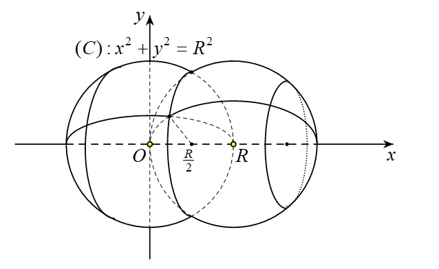 Cho hai mặt cầu $\left( S_{1} \right)$, $\left( S_{2} \right)$ có cùng bán kính $R$ thỏa mãn tính chất: tâm của $\left( S_{1} \right)$ thuộc $\left( S_{2} \right)$ và ngược lại. Tính thể tích phần chung $V$ của hai khối cầu tạo bởi $(S_{1})$và $(S_{2})$.