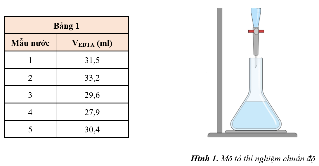 Tiến hành chuẩn độ với 5 mẫu nước, thể tích của dung dịch EDTA đã tham gia chuẩn độ được ghi trong bảng 1 như sau: