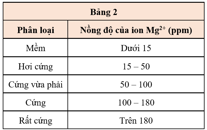 Ion Mg2+ trong nước cao gây ra hiện tượng nước cứng, gây ảnh hưởng nhiều đến đời sống. Bảng 2 cho biết thông số để phân loại nước cứng dựa nào nồng độ ion Mg2+ như sau: