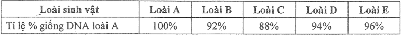 Để xác định mối quan hệ họ hàng giữa loài A và các loài B, C, D, E, người ta nghiên cứu mức độ giống nhau về DNA của các loài này so với DNA của loài A. Kết quả thu được (tính theo tỉ lệ % giống nhau so với DNA của loài A) như sau: