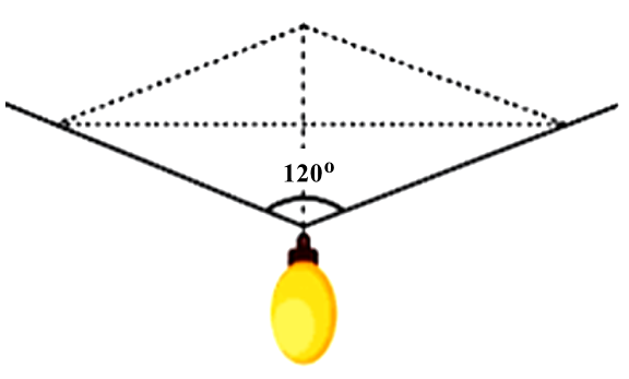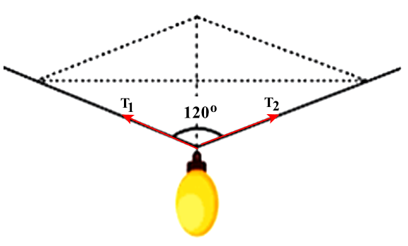 Một bóng đèn được treo tại chính giữa một dây nằm ngang làm dây bị võng xuống. Biết đèn có khối lượng là 500 g và góc giữa hai nhánh dây là $120^{0}$. Lấy $g = 10m/s^{2}$.