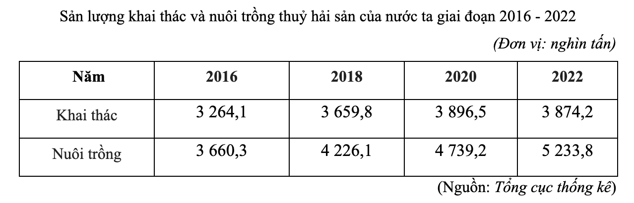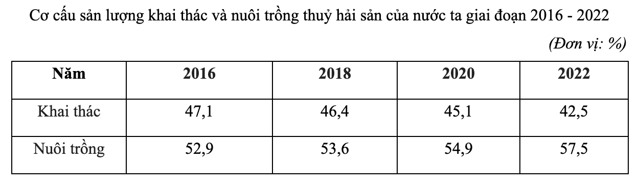 Dựa vào bảng số liệu hãy chọn nhận xét đúng về sự thay đổi cơ cấu sản lượng khai thác và nuôi trồng thuỷ hải sản ở nước ta giai đoạn 2016 - 2022?