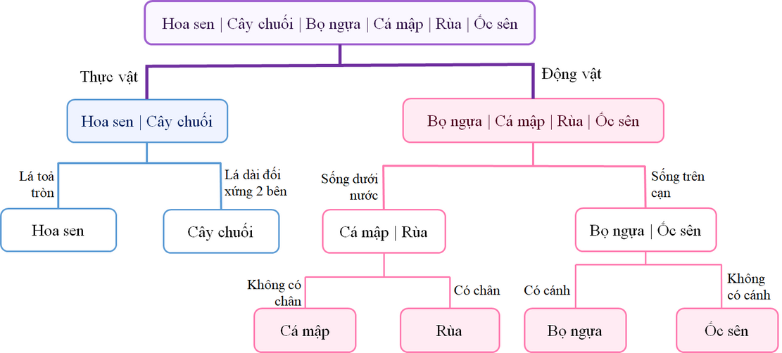 Xây dựng khóa lưỡng phân để phân loại các loài sinh vật sau: hoa sen, cây chuối, bọ ngựa, cá mập, rùa, ốc sên.