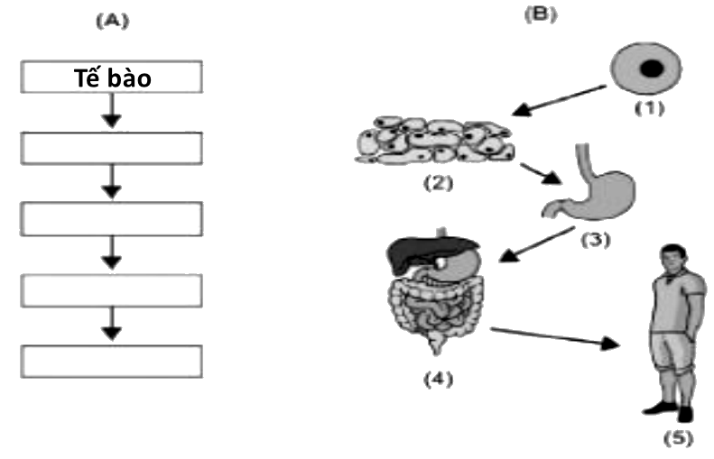 Quan sát sơ đồ các cấp độ tổ chức của cơ thể đa bào (từ nhỏ đến lớn) đã được học, sau đó điền tên các cấp độ tương ứng vào cột (A) theo thứ tự từ thấp đến cao.