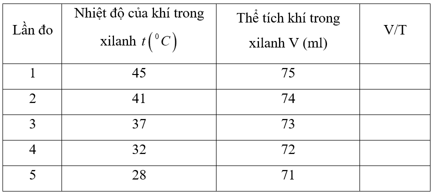 | a) Giá trị của $\dfrac{V}{T}\,\,\left\lbrack \dfrac{ml}{K} \right\rbrack$ ở các lần đo được coi là không đổi. | ||