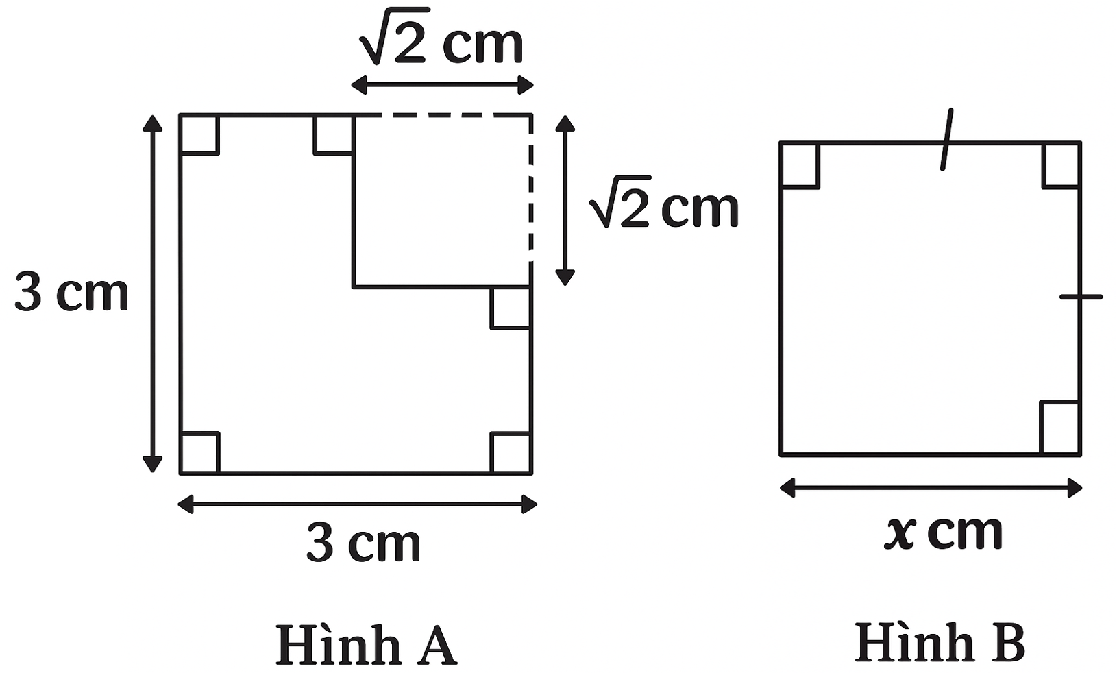 Ở hình vẽ bên biết hình $A$ và hình vuông $B$ có diện tích bằng nhau. Khi đó: