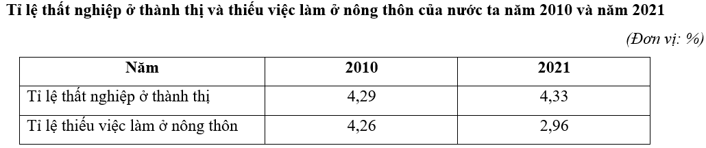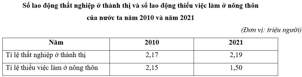 a) Tính số lao động thất nghiệp ở thành thị và số lao động thiếu việc làm ở nông thôn của nước ta năm 2010 và năm 2021.