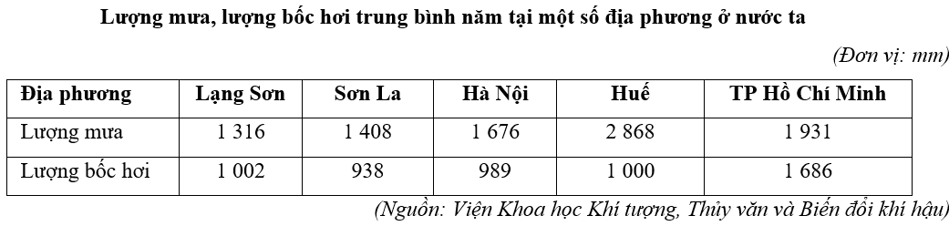 Cho bảng số liệu:Căn cứ vào bảng số liệu trên, hãy cho biết địa phương có cân bằng ẩm
