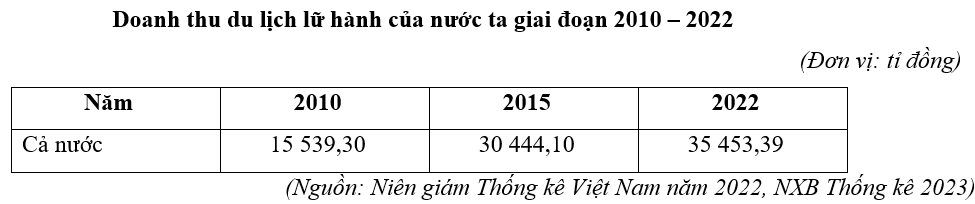Căn cứ vào bảng số liệu, hãy cho biết tốc độ tăng trưởng doanh thu du lịch năm 2022 tăng bao nhiêu % so với năm 2010? (làm tròn kết quả đến hàng đơn vị).