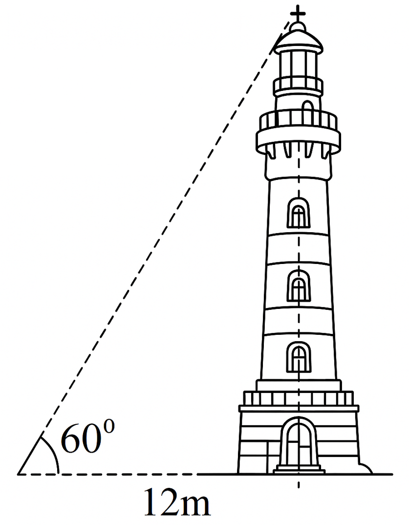Một tòa tháp có bóng trên mặt đất dài 12 m, biết rằng góc tạo bởi tia nắng mặt trời với